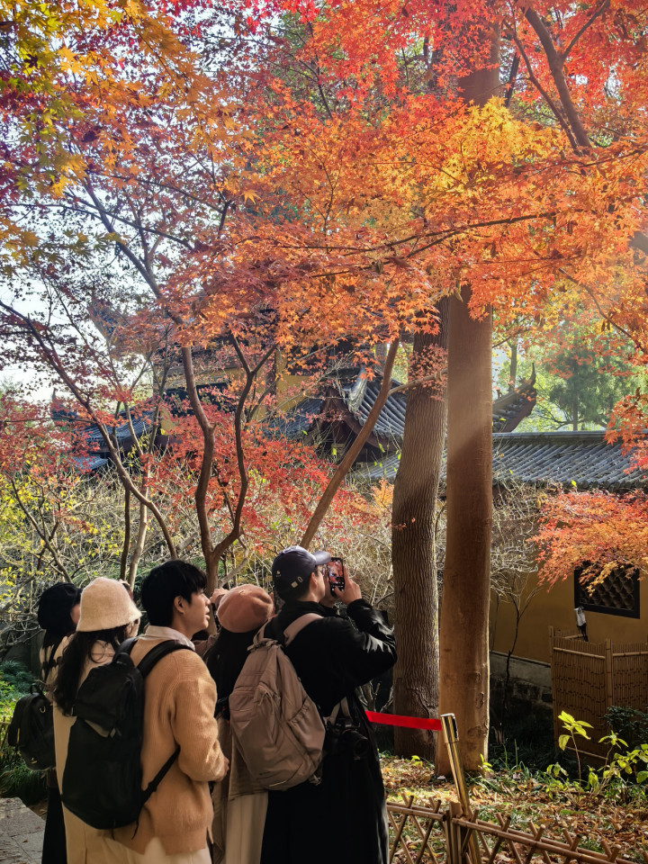 灵隐寺的枫则与佛音相伴,寺院香火缭绕,晨钟暮鼓不绝,红枫藏于高处茂竹修林间,虽仅一两株点缀,却红得纯粹、红得有信仰。风吹枫枝,红叶飒飒作响,与婆娑竹影、诵经佛号相融,似在诉说千年禅意,让人于枫情中悟得“一念清净,万般自在”的禅理。