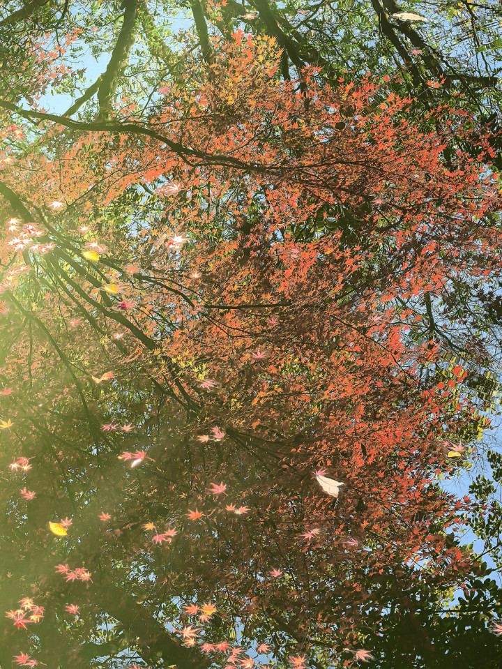 飞来峰的秋,既有视觉惊艳,更有听觉清悦,溪涧流水与红叶相拥,淌出独属初冬的枫音。从飞来峰小山门往前百余米,溪流蜿蜒穿梭古树群间,三百年古银杏、五百年栎树、八百年朴树沿溪而立,叶片凋零时,焦糖色枯叶铺满溪岸,踩上去窸窣作响,与溪水潺潺相映,成了山林间最治愈的声响。溪边红枫临水而生,枝叶垂落水面,红叶随流水轻漂,或搁浅青石之上,或漾在浅滩之间,流水冲刷红叶的轻柔摩挲声,似老者低语,若少女呢喃。