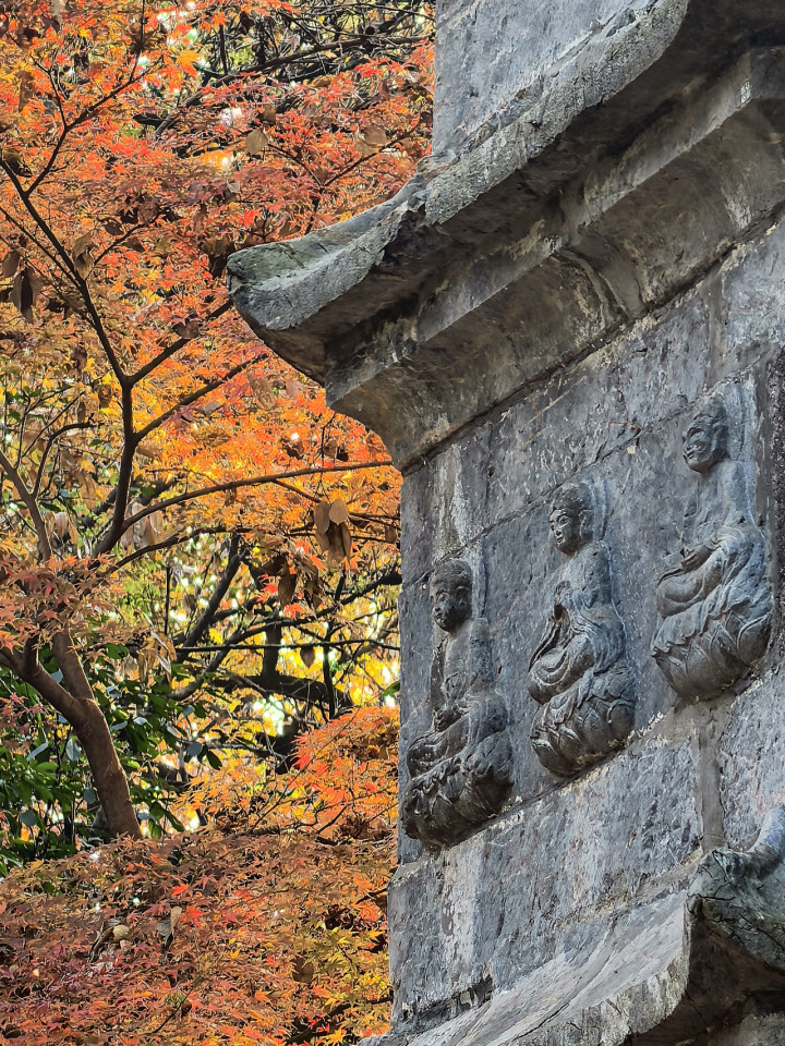 飞来峰摩崖造像遍布崖壁,自五代至宋元,历经数朝雕琢,佛像姿态各异,神情肃穆,每一尊都承载古人的信仰与匠心,然造像群周边却难觅红枫踪迹。我常遐想,若在石刻边植几株枫树,让其扎根崖壁缝隙,与石佛相伴千年,该是何等景致。此处所见,仅是寻常山林黄叶,落在石佛肩头、脚边,似在为古佛拂去岁月尘埃。
