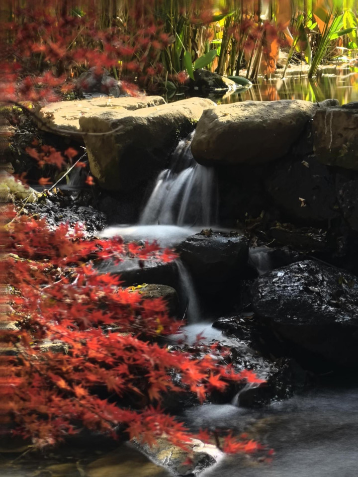 永福寺溪流藏于山坳间,顺石阶流淌,沿溪而行,流水携红叶一路向前,偶遇石块阻挡,便溅起细碎水花,红叶在水花中打转,声响清脆悦耳。静心倾听,能辨出不同枫音:高处枫枝晃动的飒飒声,空中飘落时被枝干遮挡的微响,低处终与流水相拥的轻吟,三者交织,成了深秋山林里最动听的乐章。
