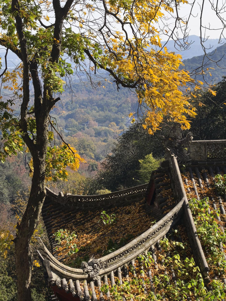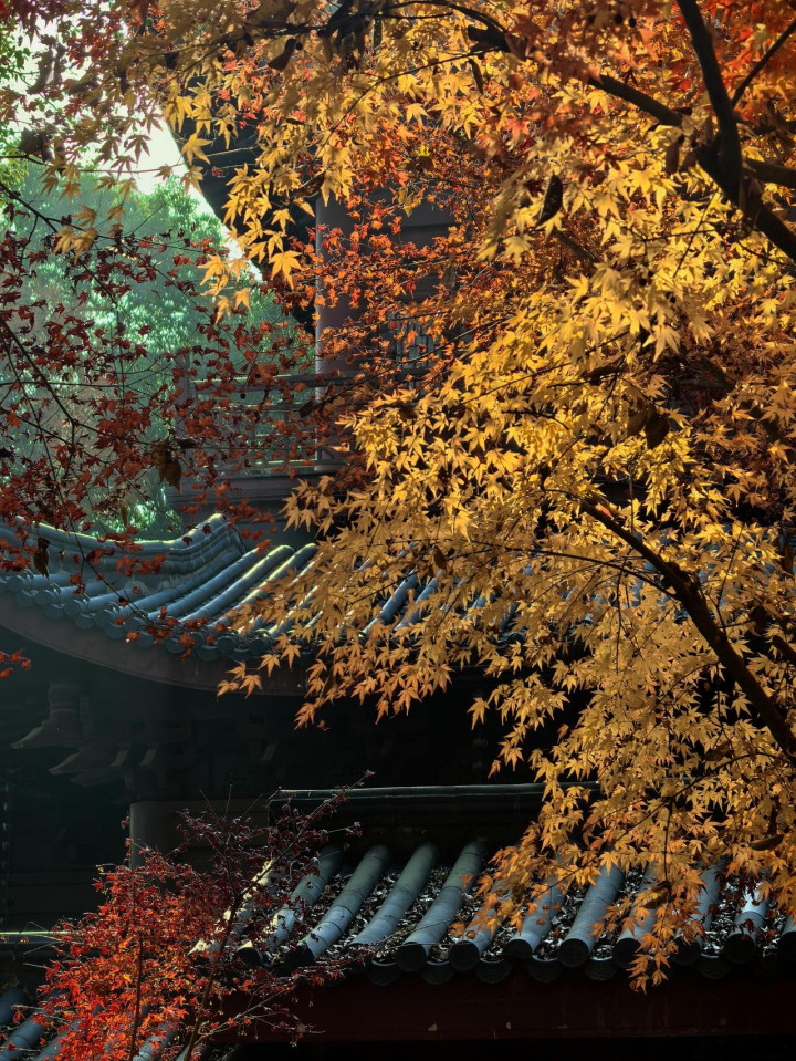 迦陵阁前平台西望,更是一幅天然三重画卷:近处观音宝殿的深灰瓦当纹路清晰,檐角翘然欲飞;稍远枫梢涌动如绯云;再往远,北高峰山脉苍郁连绵。灰瓦、红枫、青山层层递进,将山寺秋景的雅致勾勒得淋漓尽致。