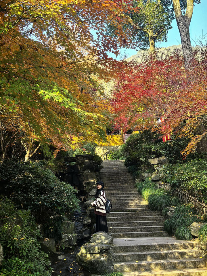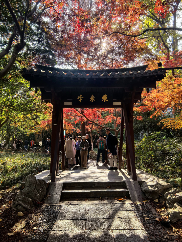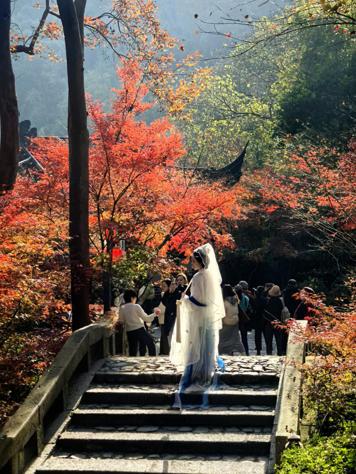 秋冬露重霜浓,杭城的诗意大半藏进了山林间,而飞来峰的枫景,便是这诗意里最浓艳的一笔。在这片蓊蓊郁郁的秘境里,灵隐、永福、韬光三寺依山而卧,古佛石刻静立千年,溪涧流水潺潺不绝,红枫与禅意相融,古韵与秋光共生,每一步探寻,都能撞见自然与人文交织的惊艳,在我眼中,这里堪称杭城山林赏枫的极致之境。