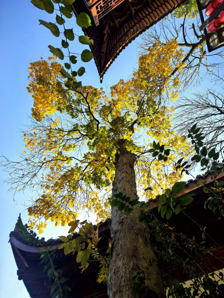 灵隐寺外枫景则添几分古朴厚重,台门内古树群中,红枫与百年朴树、栎树相依。秋冬时节朴树落尽叶片,枝干瘦劲如老者,而红枫恰似热情少年,朱红枝叶攀附其间,为沧桑古树平添青春活力。