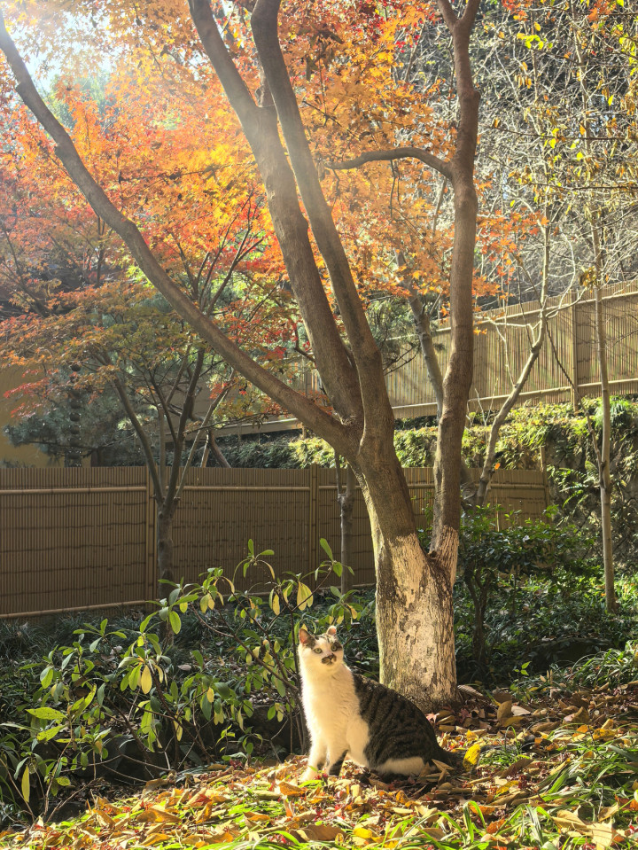 冷泉亭周边溪流最是清幽,溪水从山间奔涌而出,清冽澄澈。亭畔并无枫树,唯有几株银杏树,金黄杏叶飘落清凌泉水,打转浮沉。溪涧大群锦鲤误认是游人投喂,便围着叶子巴巴晃悠,憨态可掬。