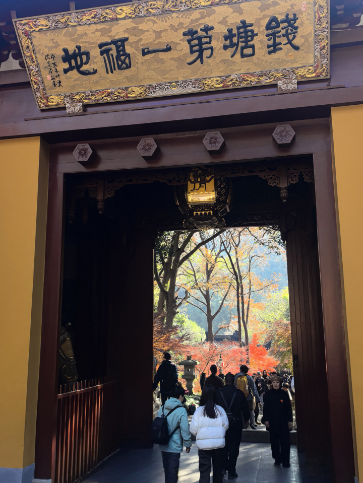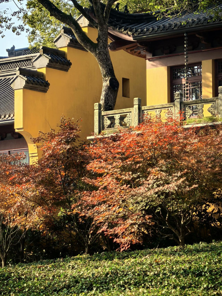 飞来峰的枫自带禅意底蕴,与寺内无患子叶相映,朱红似火,金黄如霞,在晨钟暮鼓间,藏着清净淡然的禅心。韬光寺禅意最是浓厚,这座始建于唐穆宗长庆年间的古刹,以朝佛、观日、观海三绝闻名,白居易任杭州刺史时,常在此与韬光禅师谈诗论道,千年岁月沉淀,让寺院每一处景致都透着禅韵。寺内无患子树遍布转角,黄澄澄叶片随风摇曳,光影斑驳洒于地面,与院内零星红枫相映,红黄交织,暖而不燥。