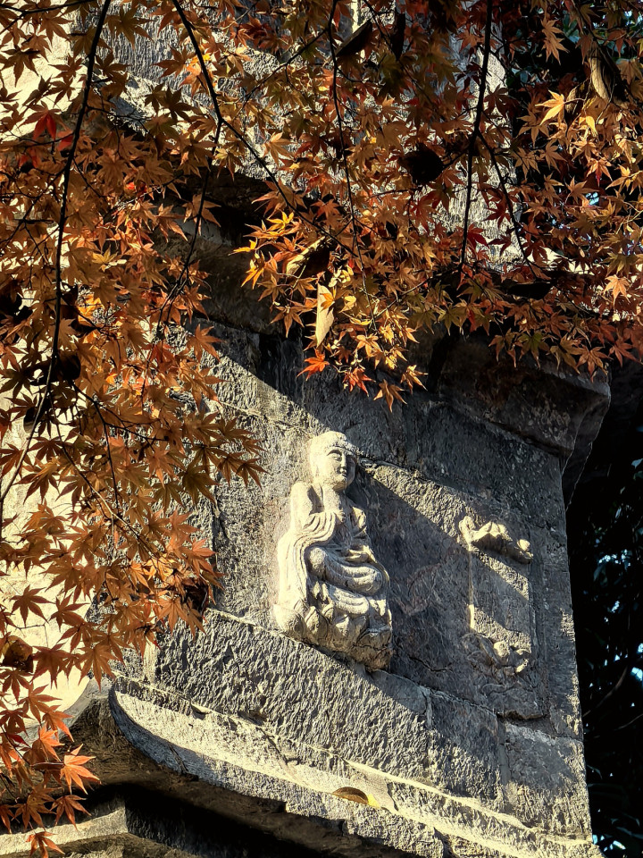 于石刻佛像之畔赏枫,是我近年心底偏爱的雅事,除此以外,杭城再难寻这般佳境。理公之塔边,多数游人目光皆聚焦古塔,鲜少留意塔旁红枫,更难赏二者同框之美,我心中不免为红枫叫屈—,恰似相声里的主配角,主角虽叫好叫座,却也不该忽视“捧哏”红枫的点缀之妙。