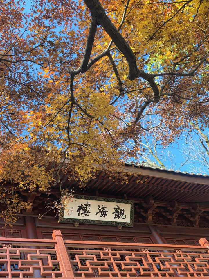 无患子自古便是祥瑞之物,“无患”二字寓意无忧无虞,承载人们对平安顺遂的祈愿,在佛家文化中,更象征清净心灵、驱散烦恼。立于无患子树下,看金黄叶片缓缓飘落,身旁红枫静静伫立,晨钟响起,悠远钟声漫过山林,红叶轻颤,黄叶纷飞,心在景致中渐趋沉静,褪去尘世浮躁,只剩安然自在。观海楼前,红枫与无患子叶铺就一地锦绣,抬眼可见西湖一角波光粼粼,低头能赏红黄叶影交错,历史厚重与当下静谧相融,禅意在一俯一仰间悄然滋生。